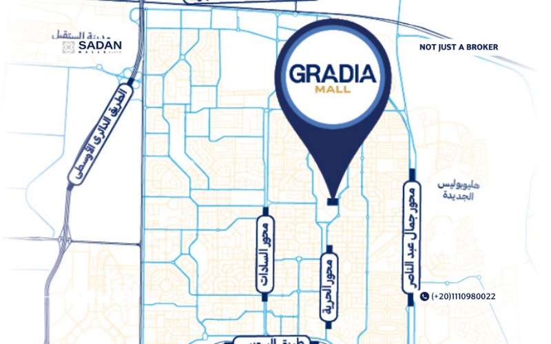 اختارت شركة البروج للتطوير العقاري موقع حيوي للغاية يخدم الكثير من الأفراد، على محور الحرية بالتحديد يتمتع جراديا مول الشروق سيتي بموقع استراتيجي يمكن الوصول إليه بسهولة من مختلف الأماكن لقربه من الدائري الأوسطي ومحور جمال عبد الناصر، ونأتي لتصميم المشروع الفريد المبتكر وفق التصاميم الأوروبية العصرية، حيث صممت المول بنظام المصاطب والـ Double Face مما يمنح المتواجدين إطلالات رائعة على اللاندسكيب.